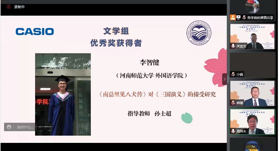 2022年5月20日,由教育部高校外语专业教学指导委员会日语分委员会、中国日语教学研究会、北京日本学研究中心和卡西欧(中国)贸易有限公司联合主办的第十四届中国日本学研究"卡西欧杯"优秀硕士论文奖颁奖典礼以“线上”方式举办。我院2021届日语语言文学专业硕士毕业生李智健的论文“《南总里见八犬传》对《三国演义》的接受研究”获文学组优秀奖。论文指导教师,我院硕士生导师孙士超同时获得“优秀论文指导教师”奖。