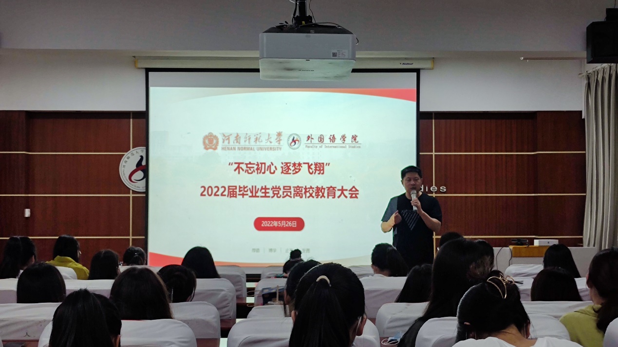 5月26日晚,外国语学院于院国培教室举行“不忘初心,逐梦飞翔”2022届毕业生党员离校教育大会。外国语学院党委副书记曹崇、党委组织工作负责人刘晓涵及全体毕业生党员参加会议。