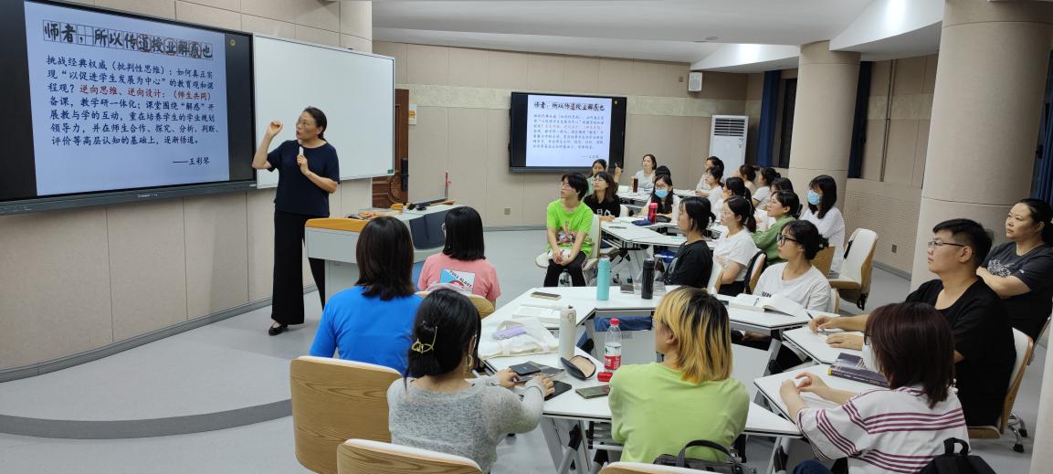 王彩琴教授以“学习前置,问题驱动——让学生成为课堂学习活动的主体”为题与大家进行分享。首先,她通过对《义务教育课程方案(2022年版)》和《普通高中课程方案(2017年版2020年修订)》这两个课程方案的解读,明确了在教育活动中教什么,怎么教,为什么教的问题。她特别指出,教师的任务是“Teaching Learning”,学生的任务是“Learning Teaching”,要在师生共同备课,在教和学的互动中形成“教学研一体化”的课程模式。随后,王彩琴教授从全新角度阐释了“何为传道授业解惑?”创造性地提出了“解惑-授业-传道”的逆向思维和逆向设计概念。紧扣“学习前置,问题驱动”这一主题,王彩琴教授认为课堂教学应该以“解惑”为出发点开展教与学的互动,从而培养学生对“业”的规划领导力,并在师生合作、探究、分析、判断、评价等高层认知的基础上,逐渐悟“道”。最后,落实到新课标的具体要求,她将提升教师专业素养与发展学生核心素养紧密联系,介绍了建立师生集体备课,以问题为导向的“教-学-研-思”的具体实施路径。