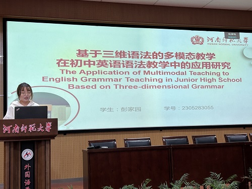 彭家园同学以《基于三维语法的多模态教学在初中英语语法教学中的应用研究》为题,分享了三维语法与多模态教学相结合的教学模式在提升初中生英语语法能力方面的显著效果。她指出,通过整合视觉、听觉等多种感官模态,可以创造丰富的学习环境,激发学生的学习兴趣,并促进语法知识的深入理解与应用。彭家园同学的研究强调了在语法教学中融入真实语境的重要性,并提出了具体的教学策略,包括设计多模态教学活动、利用多媒体资源和促进学生互动等。