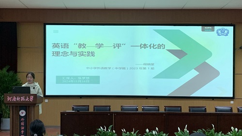 张梦想同学分享了一篇名为《英语“教—学—评” 一体化的理念与实践》的文献。她指出“教—学—评”一体化的实质内涵在于教、学、评在目的、内容和方式等方面的一致性,并通过具体的教学案例,展示了该模式在实现目标、活动、评价相统一的教学方面的实践方法。张梦想同学的分享强调了“教—学—评”一体化在提高教学效果和学生学习成效方面的重要作用。