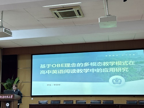 李焱华同学以《基于OBE理念的多模态教学模式在高中英语阅读教学中的应用研究》为题,分享了基于成果导向教学理念的多模态教学模式在提升高中生学习成果的显著影响。她指出,OBE理念是一种以学生为中心的教育模式,强调教育应围绕学生期望达到的学习成果来组织和实施,并探索了OBE理念与多模态教学模式在高中英语阅读教学中的应用,以提供新的教学策略和思路,优化教学效果,提升学生的学习成果。