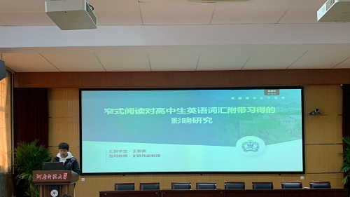 论坛伊始,7位研究生陆续分享了自己关于英语教学的研究成果和创新教学实践反思。王智豪同学以《窄式阅读对高中生英语词汇附带习得的影响研究》为题,探讨了窄式阅读策略在高中生英语词汇习得中的应用及其效果。他分享了窄式阅读的定义和理论基础,分析了该策略在词汇教学中的潜在价值,王智豪同学的研究聚焦于主题窄式阅读和系列窄式阅读对学生词汇附带习得的影响,同时关注学生对词汇学习态度的变化,旨在为高中生词汇学习提供新的途径。