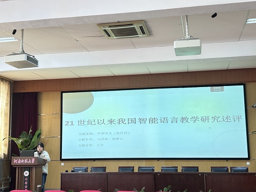 王芳同学分享了一篇以《21世纪以来我国智能语言教学研究述评》为题的研究述评。文献述评总结了21世纪以来中国智能语言教学的研究进展,通过分析191篇文献,指出了智能语言教学的发展趋势、主要研究机构和作者,以及智能导学系统和教育机器人等关键技术的应用案例,同时识别了该领域现存的不足,如技术个性化水平、与教学理论的融合深度、伦理问题,以及缺乏专用学习的平台,并对未来研究方向提出了建议,包括加强团队合作、深化技术与教学实践的结合,并建立专用智能学习的平台。