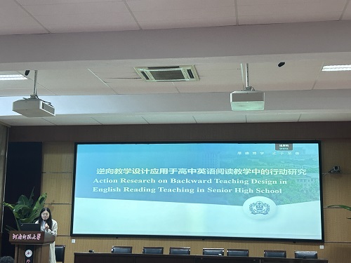 王菲同学以《逆向教学设计应用于高中英语阅读教学中的行动研究》为题,探讨了逆向教学设计的理论基础、核心概念、国内外研究现状以及具体的研究设计,旨在评估逆向教学设计对提高高中生英语阅读兴趣、阅读策略运用和阅读成绩的影响,以期为高中英语教学提供新的视角和方法论支持。她指出,逆向教学设计通过从预期学习结果出发,是从学生的学习成果出发,逆推教学活动,再逆推至学生已有的学习经验,引导教师结合课标,紧扣学科核心素养思考学习的结果和评价标准,落实学生的核心素养。
