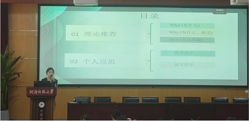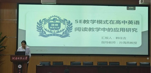 论坛伊始,7位研究生陆续分享了自己关于英语教学的研究成果和创新教学实践反思。韩佳吉同学以《5E教学模式在高中英语阅读教学中的应用研究》为题,探讨了5E教学模式在提升英语阅读教学效果中的重要性。她从研究背景、意义、概念界定、理论基础、文献综述和总结六个方面展开,分析了当前英语阅读教学中的问题,并阐述了5E模式的必要性。她强调,该模式不仅能提升学生的阅读能力,还能促进教师的教学反思与改进。