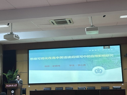 李心语同学以《思维可视化在高中英语读后续写中的应用影响研究》为题,探讨了思维可视化技术在高中英语读后续写教学中的应用及其影响。她分享了在现代信息技术背景下教学模式的变革,分析了思维可视化的核心概念和理论基础,综述了国内外相关研究现状,并详细阐述了研究设计、评分标准以及调查问卷,旨在通过实证研究验证思维可视化对提升学生英语写作成绩和兴趣的实际效果。