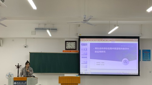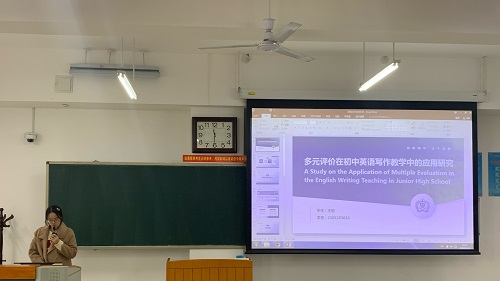 闫紫怡同学以《师生合作评价在高中英语写作教学中的应用研究》为题,分析了高中英语写作教学中评价面临的挑战,详细阐述了师生合作评价的概念、特点和实施步骤。在研究设计部分,她采用了测试法、问卷调查法和访谈法,以一个高中班级为研究对象,进行了系统的实验研究,旨在探究师生合作评价对高中生英语写作能力的影响以及师生的态度变化。