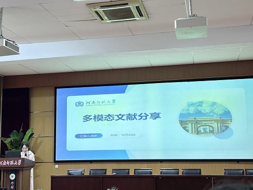 吴婷同学以“多模态”为主题,进行了关于多模态教学的文献分享。她指出,数智化时代下,多模态教学在教育领域的应用受到越来越多的关注。吴婷同学指出,多模态教学是指利用视觉、听觉、触觉等多种感官模式进行教学,包括语言、文字、视频、图像、声音、手势等。除此之外,她强调要融合多种教学方式,充分调动多种感官,强调学生的主体性,鼓励学生积极参与和互动。