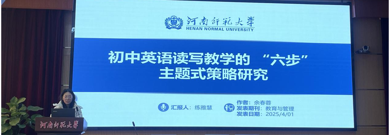 第一位练雅慧同学为大家分享了期刊《教育与管理》中的一篇文章——《初中英语读写教学的“六步”主题式策略研究》。她从研究背景、研究目的、核心理论与概念、“六步”主题式教学策略与参考文献五个方面为同学们进行了详细的讲解,通过解析单元主题,定位认知、语言、实践目标;通过整合课内+课外阅读素材,构建主题素材库;通过创设多维度主题情境,激发学生的学习动机。