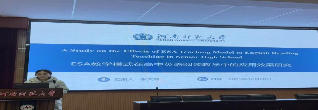 第五位张文慧同学分享题目是《ESA教学模式在高中英语阅读教学中的应用效果研究》,该研究立足高中英语阅读教学痛点,紧扣课标要求,以建构主义、输入及输出假说为支撑,探究 ESA 教学模式对学生阅读策略运用与理解表现的影响,旨在培育学习者 “语境解读与策略运用能力”,目标以素养发展为核心,依托主题语篇搭建学用桥梁,推动学生自主构建综合语言运用的实践体系。