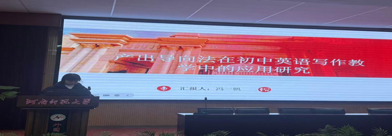 第一位冯一帆同学分享的题目为《产出导向法在初中英语写作教学中的应用研究》。该研究聚焦产出导向法在初中英语写作教学的应用,紧扣课标要求,针对教学输入输出脱节等问题,以输出假说、互动假说为理论支撑,通过实验探究应用效果、问题及成因,旨在发展学习者“写作能力”,目标以语言运用为导向,依托语篇与语境,将写作知识转化为语言能力,服务学生核心素养培养。