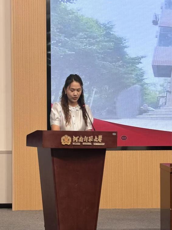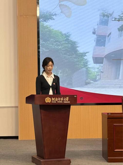之后,在校生代表王佳慧同学发言。她结合亲身经历,回顾了初入大学时的迷茫与探索,并从拥抱新变化、深耕语言专业和珍惜大学时光三个方面,分享了如何通过树立明确目标实现自我成长。