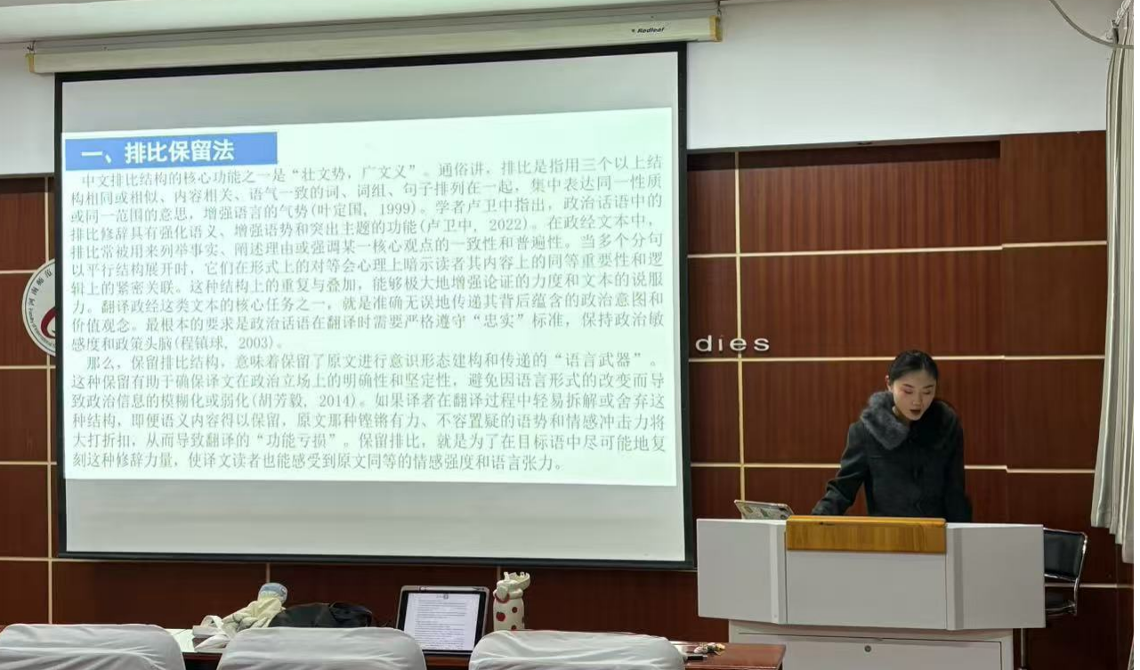 徐冉同学围绕中国时政文献外译中的具体难点展开了深入讨论。她结合时政文本与语篇,对无主句和三字组合等语言现象进行了细致的解析与现场展示,重点说明了在不同语义情境下英译的注意事项。最后,她总结了常见的翻译偏移现象,并强调扎实的翻译策略对提升中国外宣与文化外译的质量与效果至关重要。