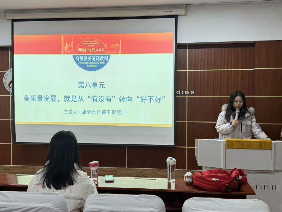 “《理解当代中国》进课堂——MTI中国时政文献翻译论坛”系列教学活动是外国语学院深化教学改革的重要举措之一。论坛自10月13日持续至12月29日,每周一晚在学院国培教室举行。论坛面向全院翻译硕士研究生,每期由2至3名2024级同学在导师指导下,围绕《理解当代中国:高级汉英翻译教程》相关主题,分享翻译方法与学习体会,系统强化学生的时政文献翻译能力,助力培养“懂政策、精翻译、善传播”的复合型外语人才,为国家国际传播能力建设贡献力量。