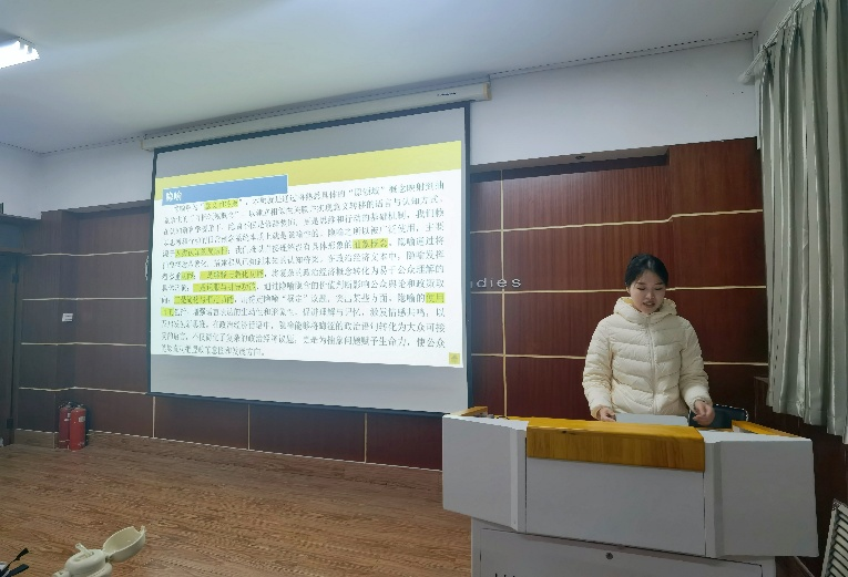 刘康同学首先阐释了“江山”与“人民”之间的密切关系,强调了人民在国家发展中的核心地位。她重点讲解了与“人民”相关的核心概念及其不同译法背后的文化认知差异。对于关键语句中二字、三字、四字、多字铺排形式,采用合并重复、一对多、多对一、概括性翻译等翻译方法,在场同学深受启发。