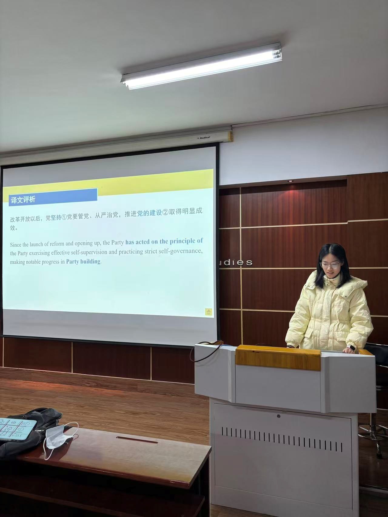 随后,牛莉娟同学就中国时政文献外译中的具体难点展开讨论。她结合丰富翻译实例,对修辞手法、流水句、无主句、反复结构及用典等高频率难点进行了细致解析与现场演示,系统介绍了各类问题的具体处理方法和技巧。最后,她对第一单元内容进行总结,强调扎实掌握这些翻译策略对提升译文质量、增强国际传播效具有关键意义。