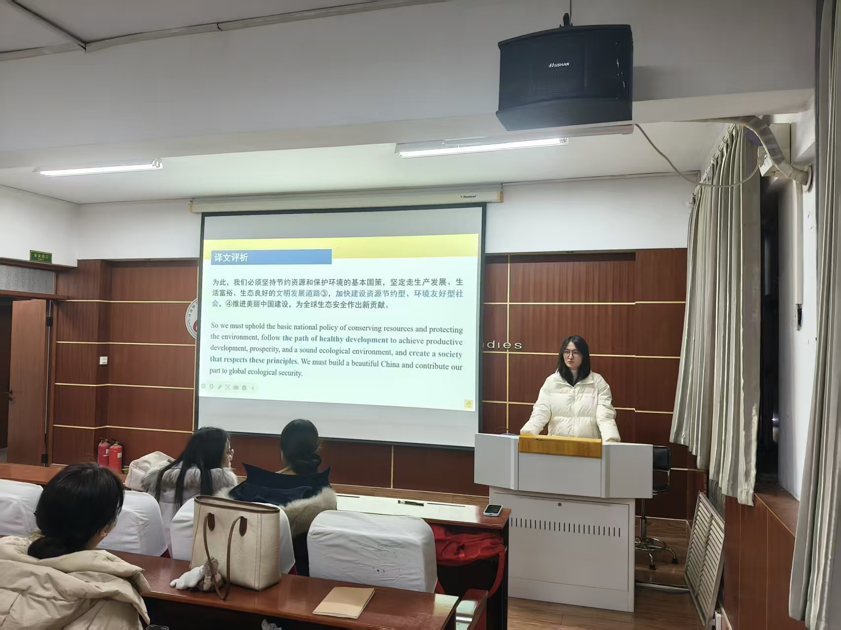 最后,郭慧洁同学分享绿色发展相关文本翻译实践。以“绿色循环低碳发展”“坚持节约资源和保护环境的基本国策”等语句为例,她解析特色表达英译逻辑;针对“生态环境”这类灵活四字格,结合语境分析译法适用场景,强调语义精准与语境适配的重要性,并分享“逻辑含蓄补全连接”技巧,通过补充连词、调整语序提升译文条理性与可读性。