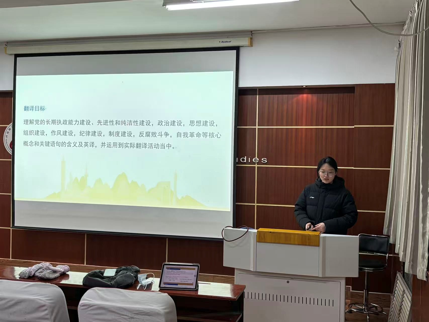 为创新翻译人才培养模式,服务国家国际传播能力建设,12月22日晚,外国语学院“《理解当代中国》进课堂——MTI中国时政文献翻译论坛”在国培教室如期举行。本次论坛由2024级翻译硕士研究生李文静、徐梦珂主讲,围绕《理解当代中国》第十一单元“打铁必须自身硬”相关主题展开深度分享,延续了系列论坛的浓厚学术氛围,为同学们搭建了优质的专业交流平台。