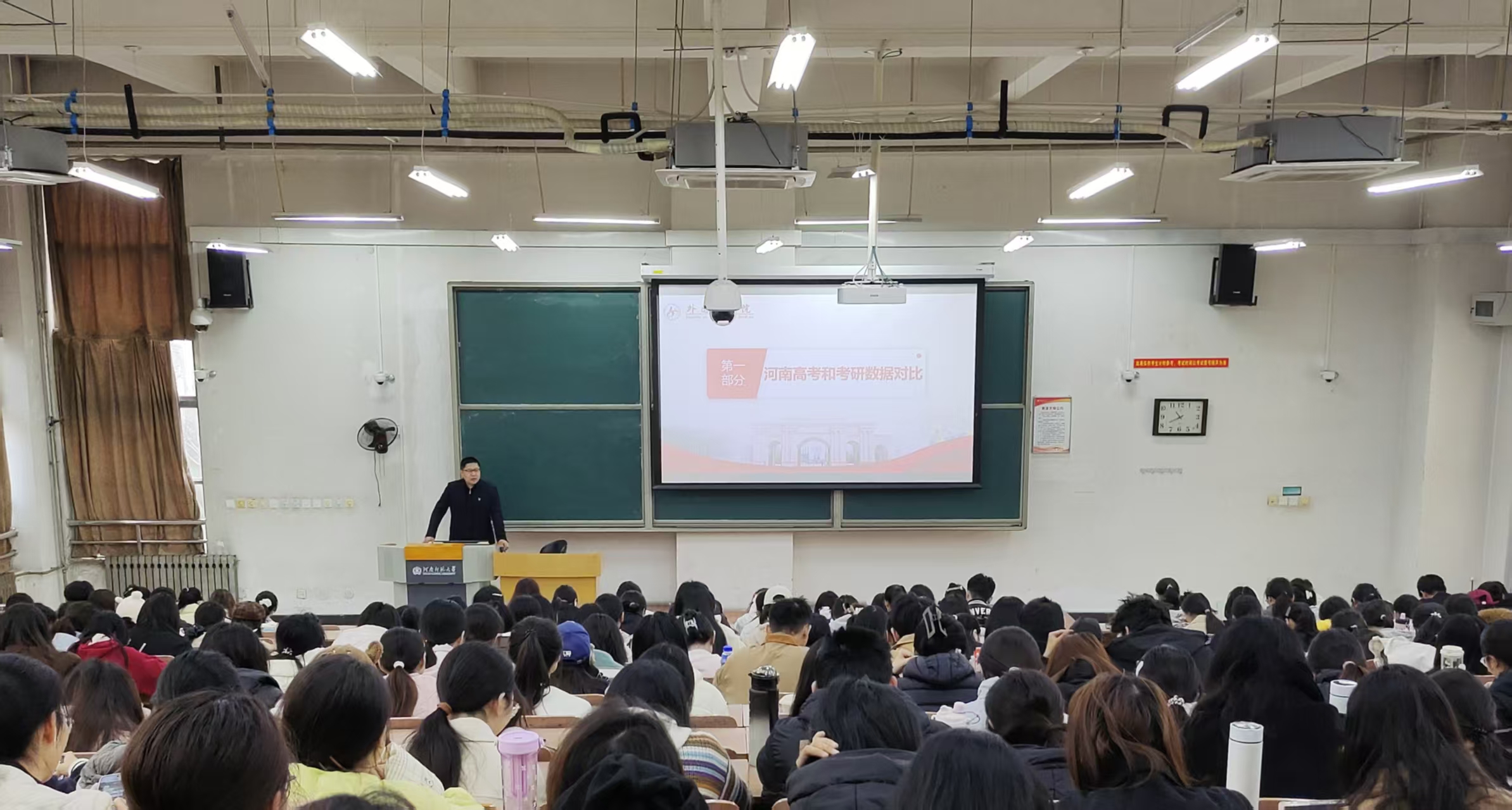 随后,院党委副书记曹崇结合学院近年考研录取率、就业去向分布等核心数据,鼓励同学们以积极心态面对挑战,以扎实学识坚定考研信心,以务实态度筑牢就业根基。他向毕业生提出三点希望:一是树立家国情怀,增强爱校荣校意识,主动担当新时代青年责任;二是科学规划考研复习,注重学习效率与心态调整,避免盲目备考;三是提前了解就业市场,提升就业竞争力,合理规划职业方向。
