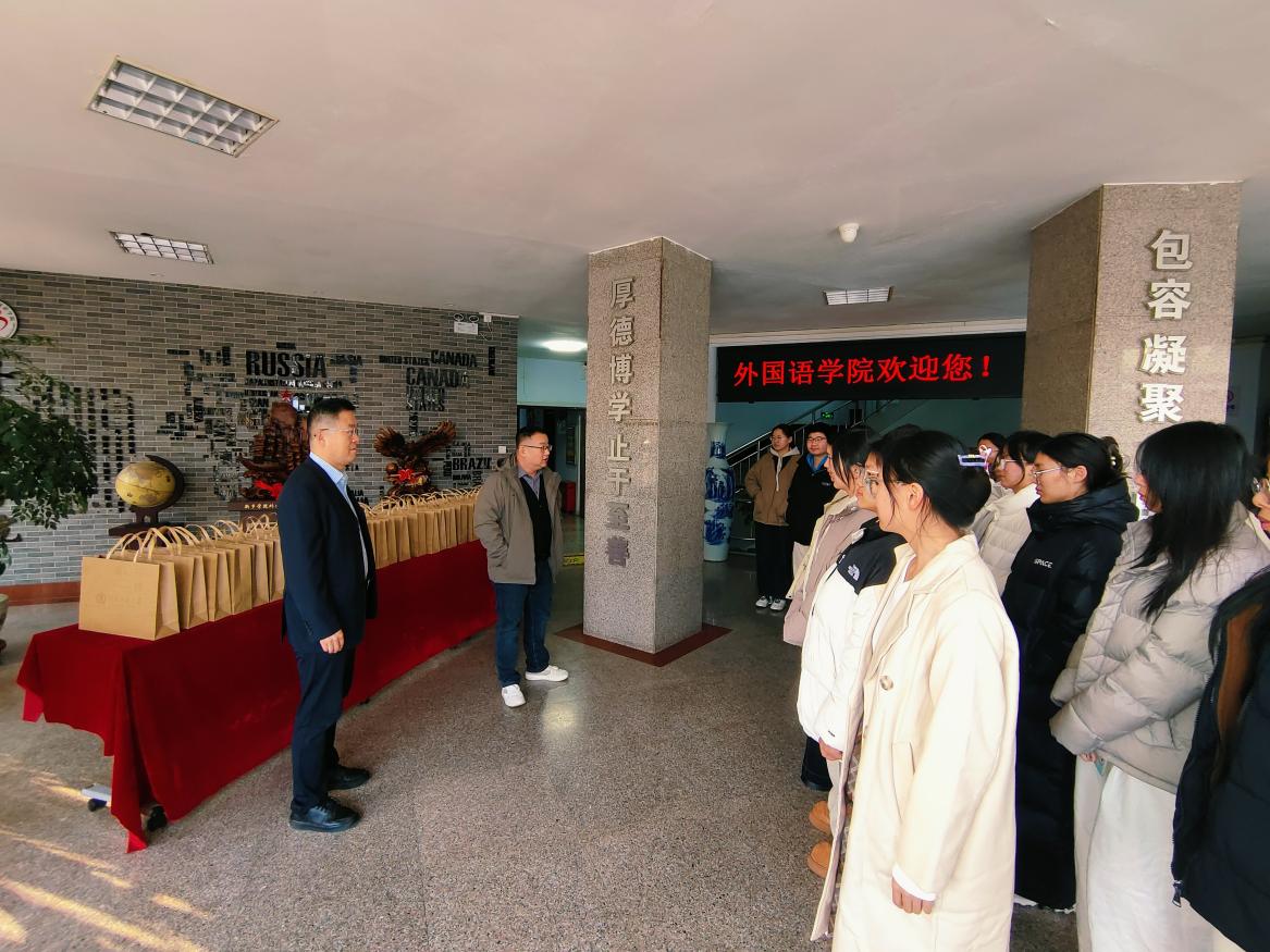 为进一步鼓舞考研学子的备考士气,坚定冲刺信念,切实做好研考服务保障工作,12月11日,外国语学院开展“‘研’路有你·‘语’你同行”慰问活动。院长刘国兵、院党委副书记鲁鹏飞、2022级专兼职辅导员及2026届考研学生共同参与。