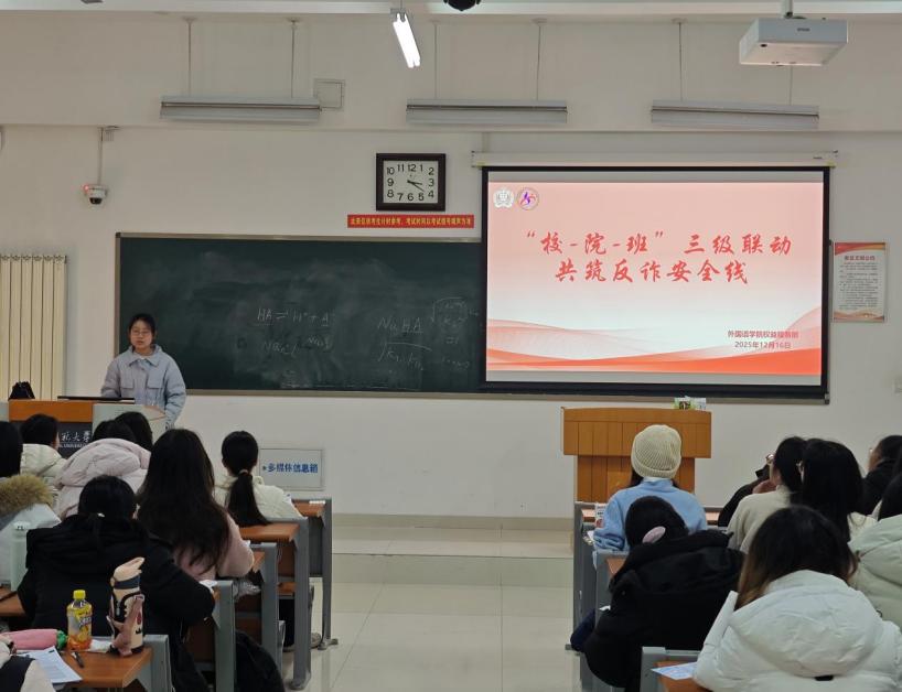 为提升学生防范电信网络诈骗的意识和能力,筑牢校园安全防线,12月16日,外国语学院在文昌楼组织开展了“校·院·班三级联动,共筑反诈安全线”主题教育活动,共计70余名学生参加本次活动。