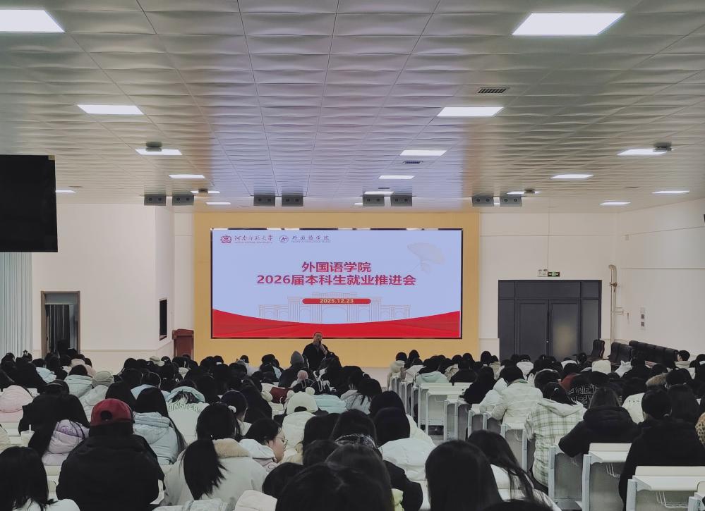 为进一步做好2026届毕业生的就业指导工作,帮助学生拓宽发展路径,12月23日上午,外国语学院在树蕙堂召开2026届本科生就业推进会。学院党委副书记鲁鹏飞、日语系主任李晓红,2022级班主任、专兼职辅导员及全体2026届毕业生参会。