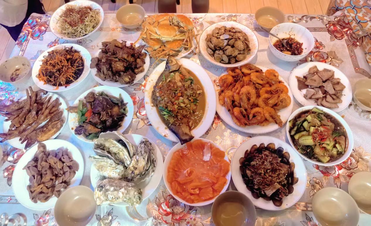 本次活动以“分享年夜饭与背后的文化故事”为主线,同学们化身“年味记录者”,通过图文形式记录与家人团聚、围坐共餐的温馨场景。活动中,同学们将镜头对准热气腾腾的餐桌,定格团圆时刻,并配以文字讲述新春故事。一桌桌承载着美好祝福的新春家宴在云端相聚,既有寓意“年年有余”的清蒸鱼、象征“红红火火”的炸大虾等传统经典年菜,也有螃蟹、生蚝、三文鱼刺身等鲜香四溢的海鲜硬菜,更有各式风味独特的小炒与家常小食,南北风味荟萃一堂,色香味俱全的佳肴透过屏幕依然令人垂涎。更可贵的是,同学们在分享美食的同时,深入挖掘了年夜饭背后的文化内涵。从食材挑选的吉祥寓意到烹饪技法的代代相传,从家传秘制的独特风味到各地春节习俗的生动演绎,同学们在创作中不仅展示了家乡独特的饮食风貌,更追溯并唤醒了那些流淌在舌尖上的珍贵文化记忆。