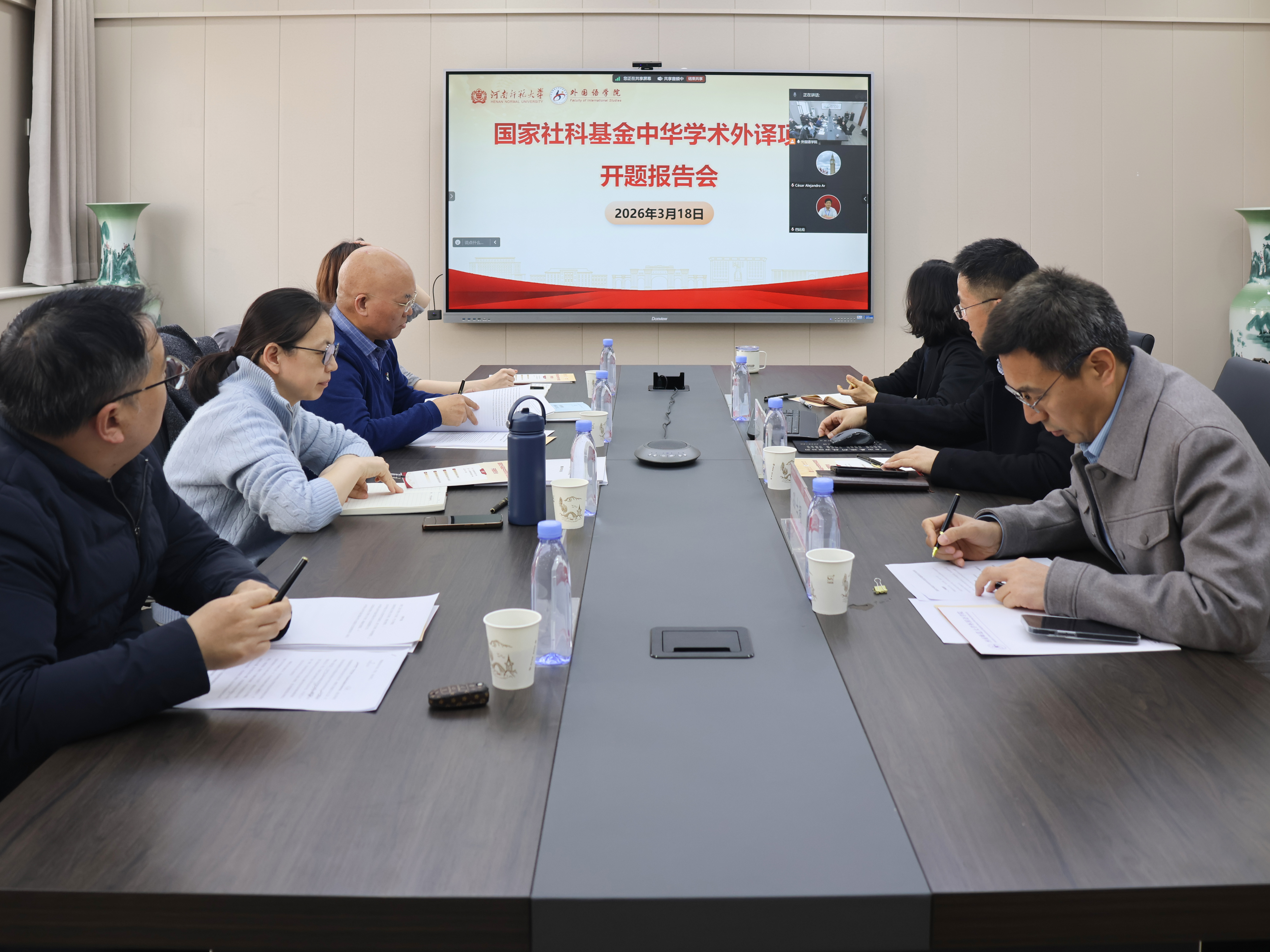 3月18日,外国语学院2025年度国家社科基金中华学术外译项目开题报告会在三楼会议室举行。浙江工商大学李文中教授、陕西师范大学拜根兴教授、华中师范大学冷向明教授、英国朴茨茅斯大学阿梅利尼教授和中国社会科学出版社国际合作与出版部负责人担任评议专家,河南师范大学社会科学处副处长王喜刚出席会议并致辞。会议由学院副院长孙士超主持。