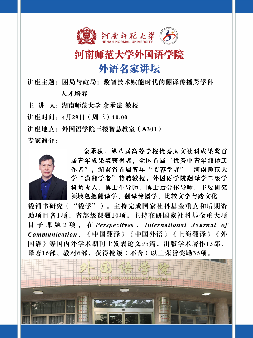【预告】外语名家讲坛:困局与破局:数智技术赋能时代的翻译传播跨学科人才培养 湖南师范大学 余承法 教授