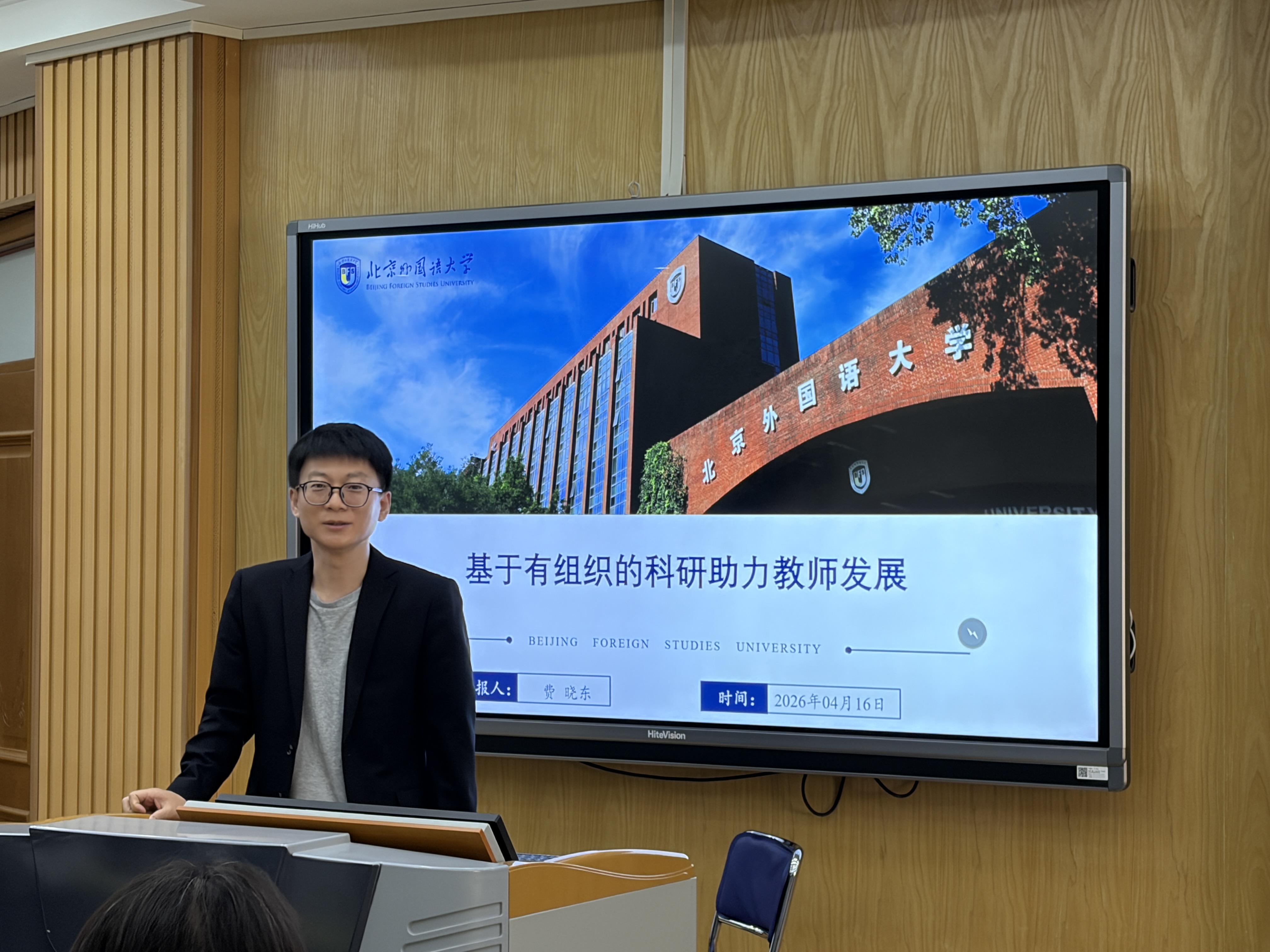 4月16日,应外国语学院邀请,北京外国语大学费晓东教授在学院A301室作了“基于有组织的科研助力教师发展”的学术报告,学院近百名师生参会聆听。学院副院长孙士超主持报告。