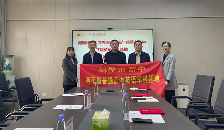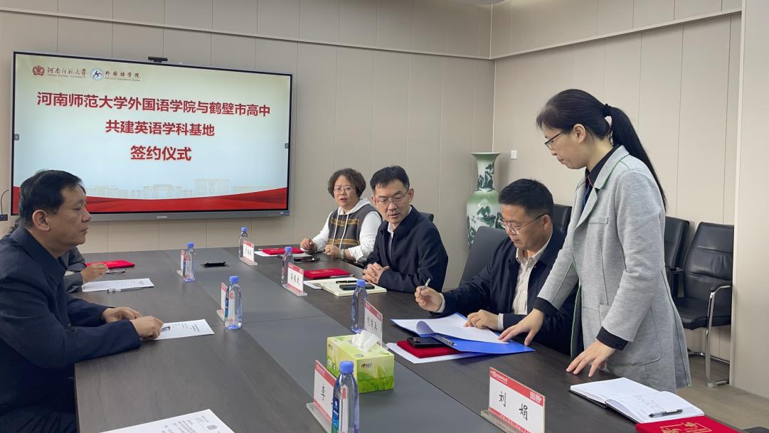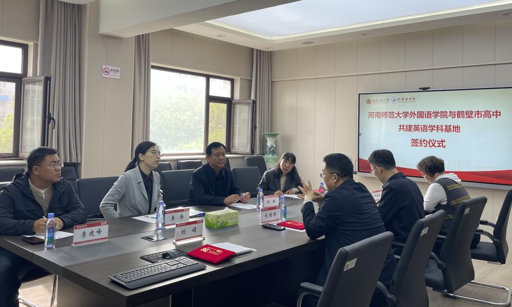 为深化高等教育与基础教育协同育人机制,推动英语学科教学改革与高质量发展,4月22日上午,我院与鹤壁市高中共建英语学科基地签约仪式在外国语学院A306会议室举行。鹤壁市高中党委书记毕辉、教务处副主任李玉英、英语教研组组长李冉、学科负责人李建峰以及外国语学院党委书记吴耀武、院长刘国兵、副院长卢海燕、课程中心主任刘娟等双方相关负责人出席仪式。
