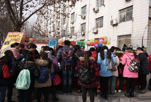 冬风凛冽,依旧吹不走同学们求知的热情,惊喜跌出的随手翻译活动如火如荼地进行。本次活动答对3题即可晋级,并获得相应礼品;翻译题目难度分为初级、中级和高级,迎合了同学们晋级的热情;翻译语种有英、日、法、俄等以英语为主,多种语言为参赛者提供更多的惊喜。活动期间,主干道旁人潮涌动,或驻足观看,或积极参与,或因答题凝眉沉思,或因答对而眉开眼笑。过程中,同学们因翻译方式不拘一格而闹出很多笑话,大家乐在其中的同时也深化了记忆。例如:译“Tomorrow is never come.”同学们的答案有直译的、意译的,非常有趣。同时,摄影成果展板前也挤满路人,欣赏各院同学们在外语文化月系列活动中的精彩表现,活动现场非常热闹。