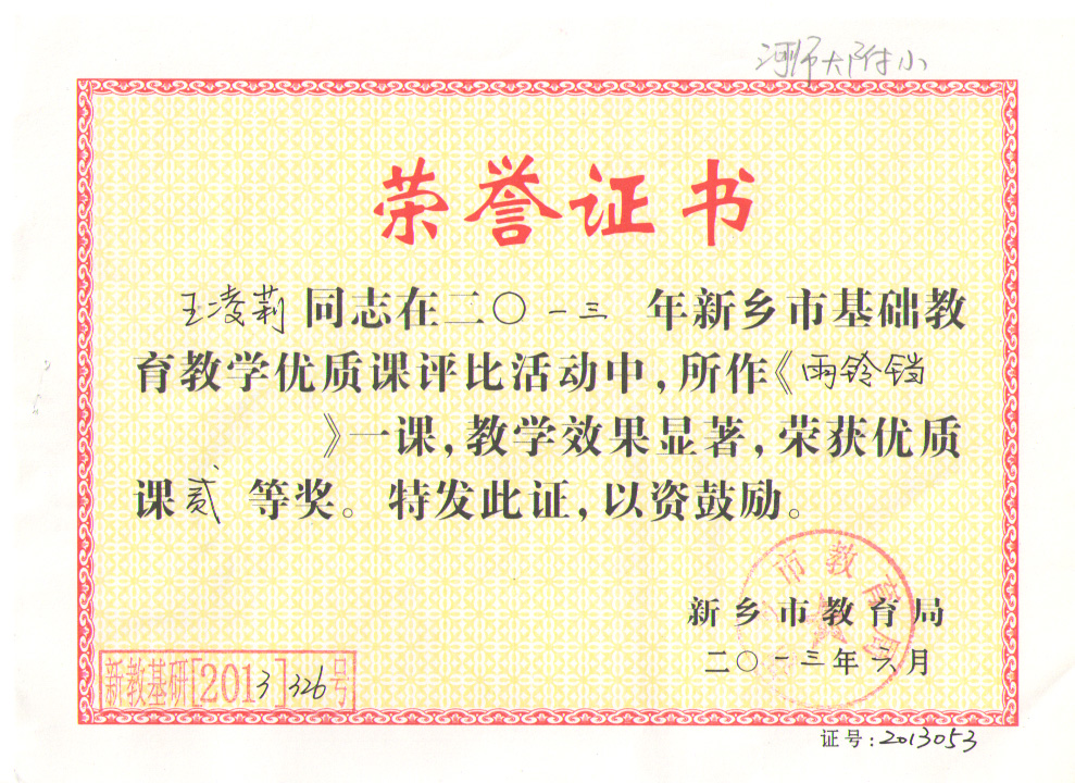王凌莉老师在2013年新乡市基础教育教学优质课评比活动中,执教的《雨铃铛》一课,教学目标明确,尊重学生身心发展规律,教学过程中激发学生的想象力和创造力,展现个性化的童真,通过多种形式的朗读体验,感受诗歌的语言美,学生学习兴趣高涨,较好地完成了教学任务,获优质课二等奖。