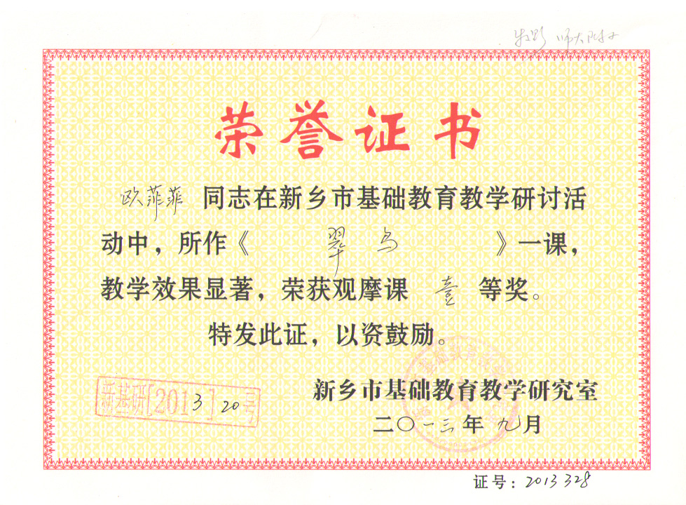 欧菲菲老师在新乡市基础教育教学研讨活动中,执教的《翠鸟》一课,课堂教学环节清晰,教学目的明确,不仅注意引导学生充分自主地读书,而且能够结合多媒体课件,抓住重点句子引导学生充分感受语言文字的魅力,使学生的内心有所触动,获观摩课一等奖。