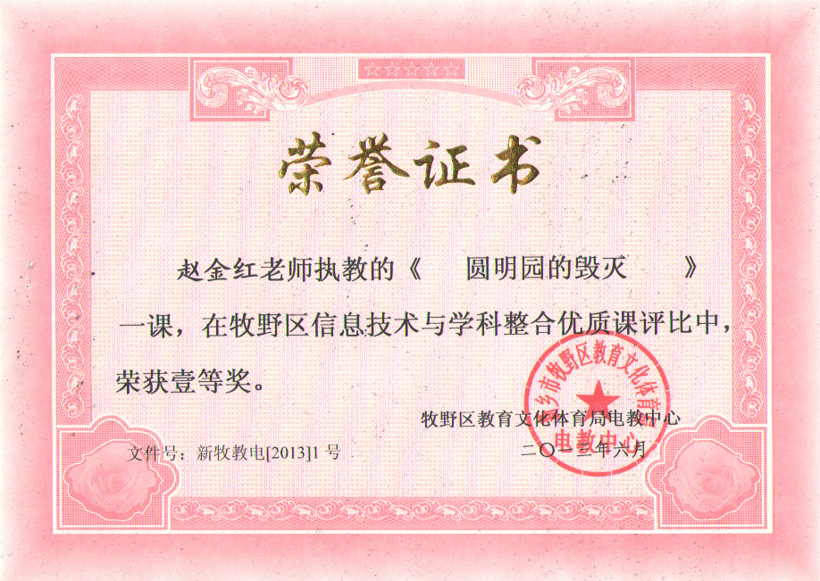 月,赵金红老师执教的《圆明园的毁灭》一课,在牧野区信息技术与学科教学整合优质课评比中,获一等奖。