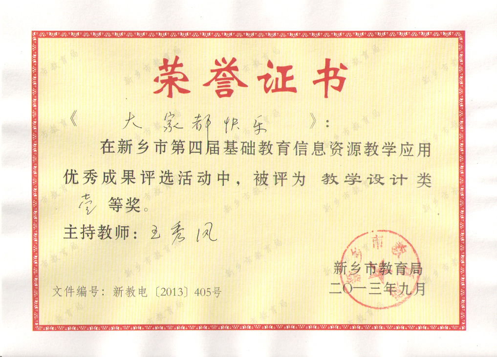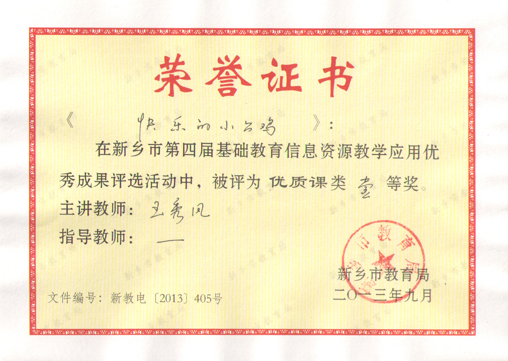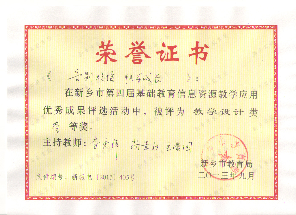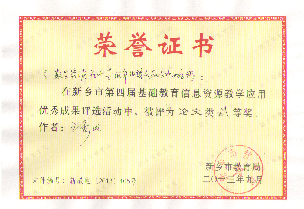2013年9月,在新乡市第四届基础教育信息资源教学应用优秀成果评选活动中,王秀凤老师获优秀成果一等奖2项、二等奖1项,李秀萍老师获优秀成果一等奖1项。