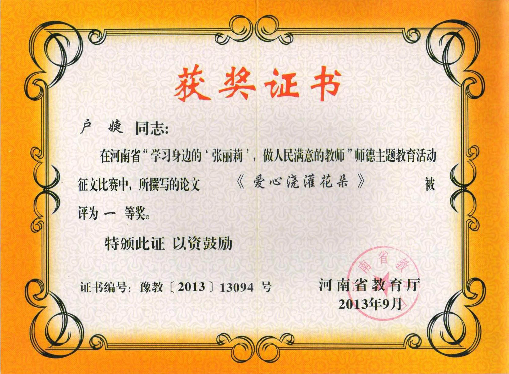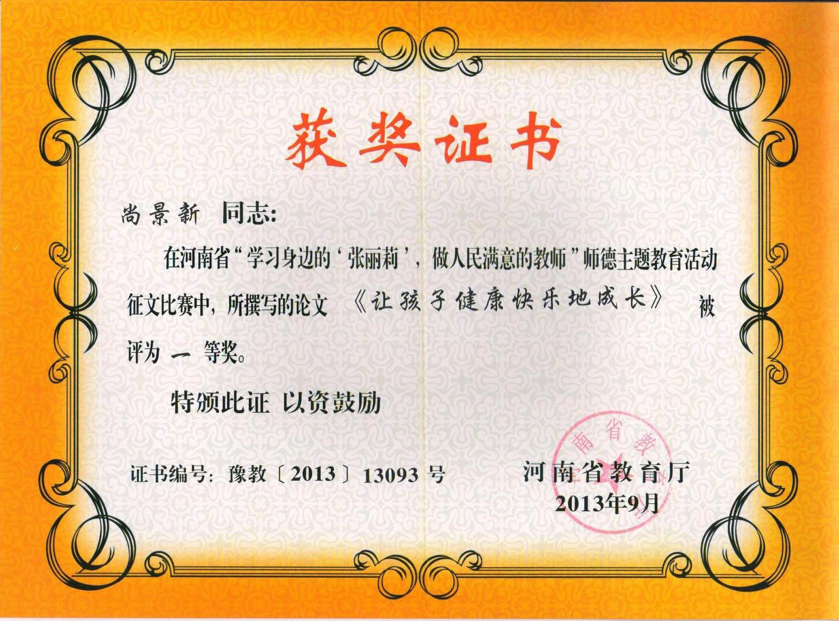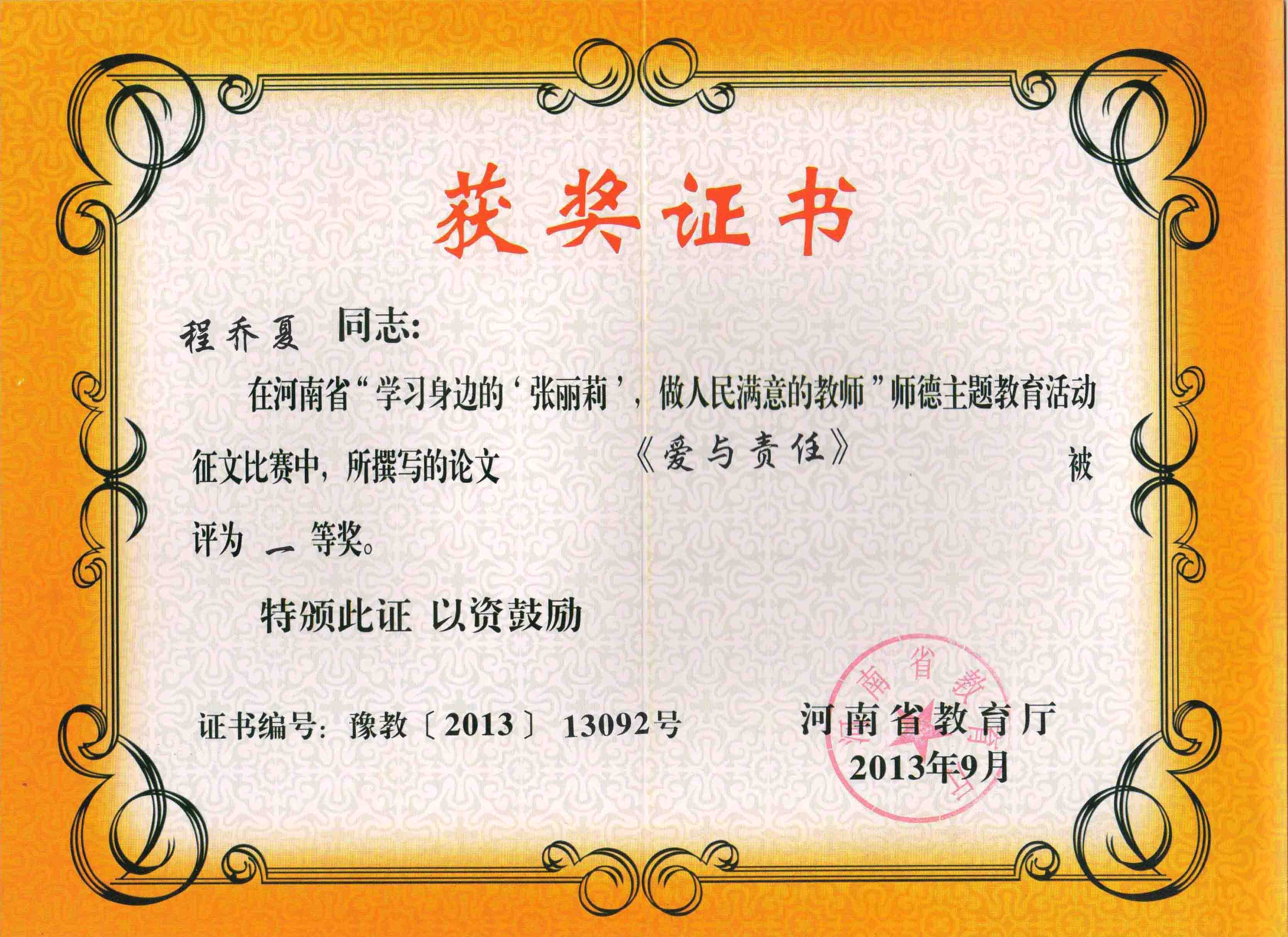 程乔夏、尚景新、扈婕三位老师在《关于开展“学习身边的‘张丽莉’,做人民满意的教师”师德主题教育征文和演讲比赛的通知》活动中,荣获河南省教育厅论文类一等奖。