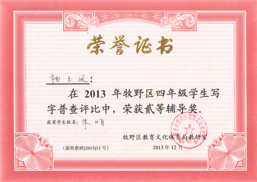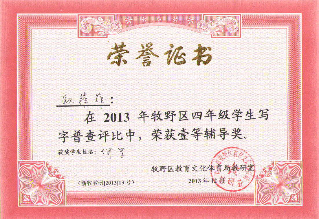 月,在牧野区四年级学生写字普查评比中,欧菲菲、杨玉凤老师辅导的学生成绩突出,荣获辅导奖。