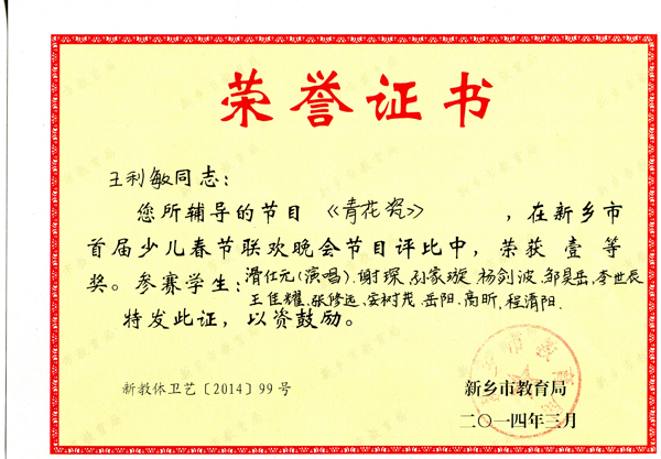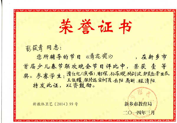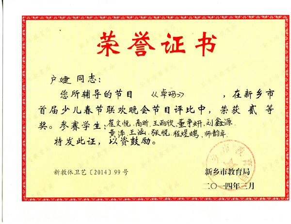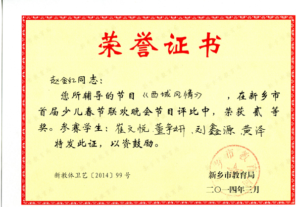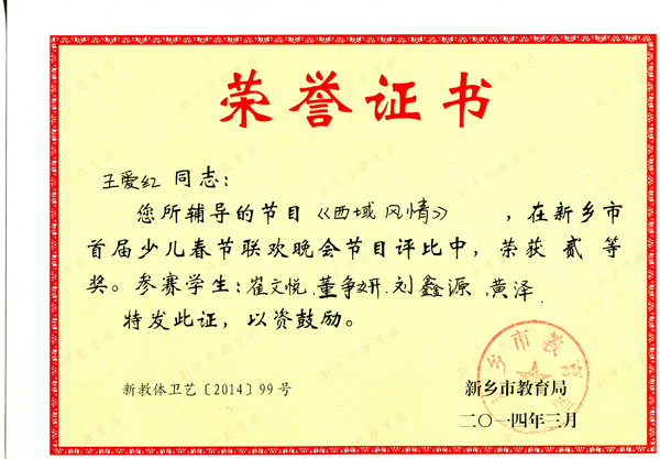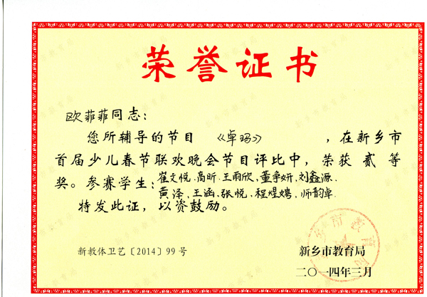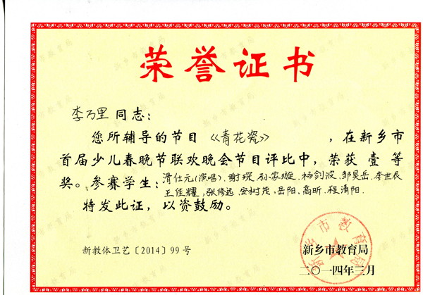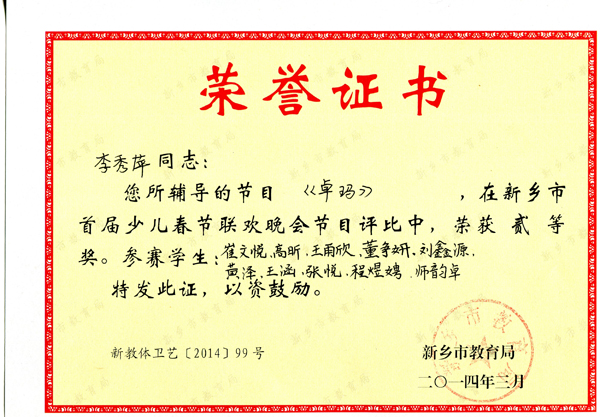 近日获悉,在新乡市首届少儿春节联欢晚会节目评比中,附属小学获得优秀组织奖,选送的节目《青花瓷》获一等奖、《西域风情》《卓玛》获二等奖。本次活动,新乡市优秀组织奖只设了1个,共有16所学校分别获得一、二等奖。