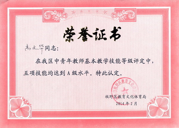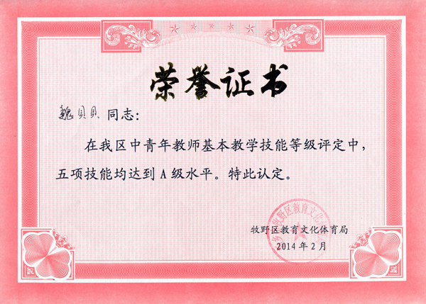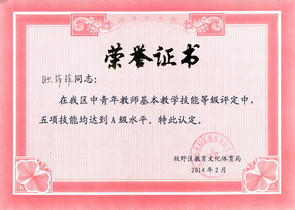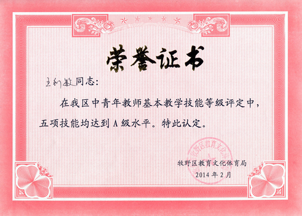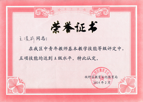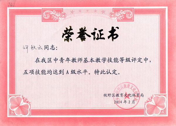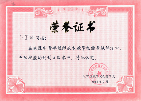 在我区中青年教师基本教学技能等级评定中,我校教师许秋云、高文华、卜景丽、欧菲菲、王利敏、魏贝贝、王凌莉7位老师表现突出,五项技能均达到A级水平。