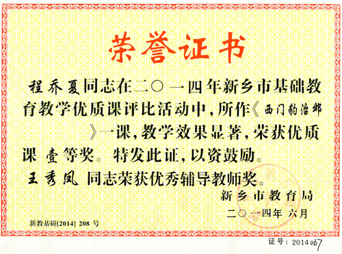 我校程乔夏书记执教的语文课《西门豹治邺》、尚景新老师执教的数学课《分数的意义》均荣获新乡市优质课一等奖。