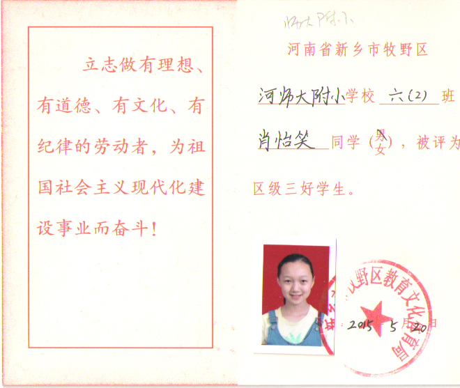 近日获悉,在新乡市、牧野区级三好学生评比活动中,李梓璐、姜乐珊等2名同学被评为新乡市三好学生;肖怡笑、张冉、常诗雨、李梦圆、孟可馨、陈丰瑞、刘子涵等7名同学被评为牧野区三好学生。