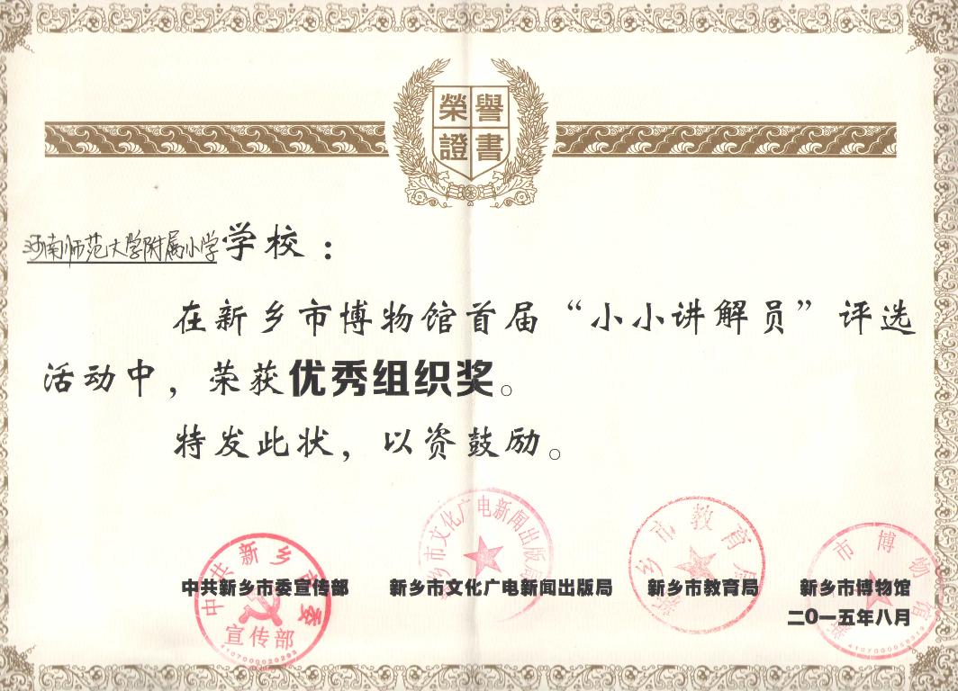 2015年8月,在中共新乡市委宣传部、新乡市文化广电新闻出版局、新乡市教育局、新乡市博物馆共同举办的新乡市博物馆首届“小小讲解员”评选活动中,附属小学认真组织学生积极参与,成绩突出,荣获“优秀组织奖”。