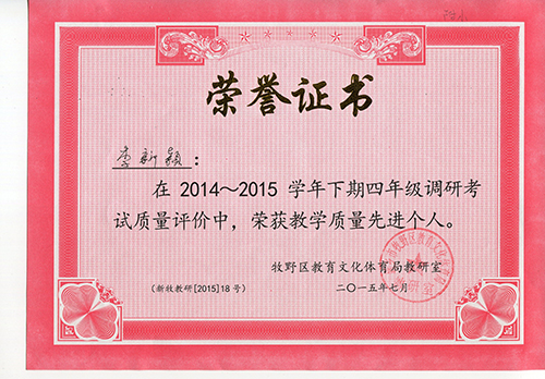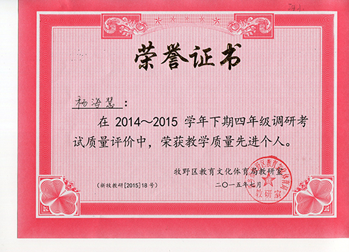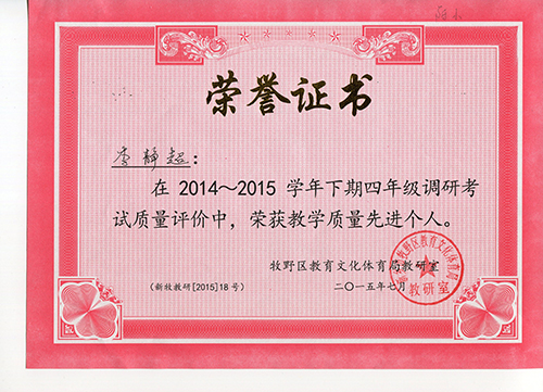 2015年6月,牧野区采用“学校之间推磨监考、全区统一改卷”的方式,进行2014-2015学年下期四年级调研考试质量评价。我校综合排名全区第一!其中语文成绩全区排名第一,数学成绩全区排名第二,英语成绩全区排名第一。李静超、李新颖、卜景丽、杨海慧4位辅导老师,全部荣获牧野区“教学质量先进个人”。