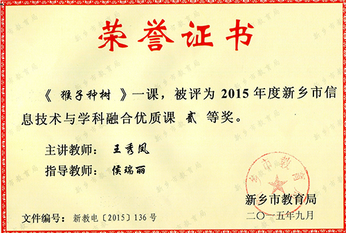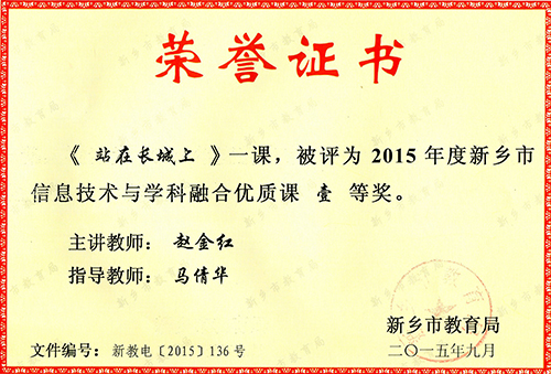 在2015年度新乡市信息技术与学科融合优质课评比中,我校教师赵金红执教的《站在长城上》获一等奖,王秀凤执教的《猴子种树》获二等奖。