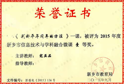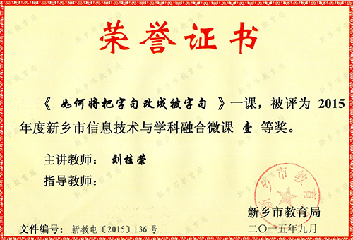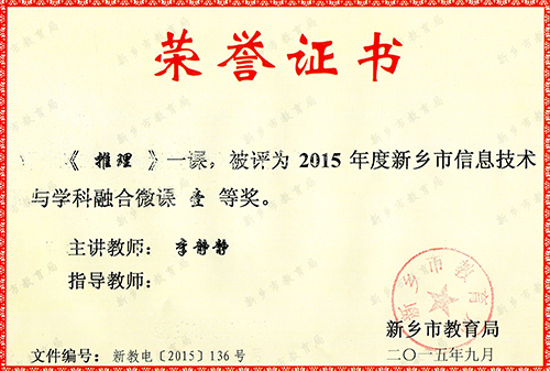 在2015年度新乡市信息技术与学科融合微课评比中,我校教师寇亚品的《判断平年闰年的方法》、李静静的《推理》、刘桂荣的《如何将把字句改成被字句》均获一等奖。