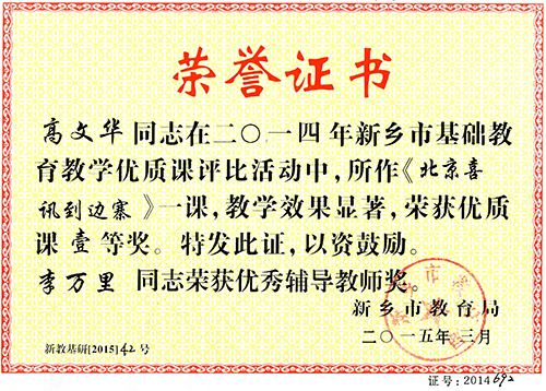 在2014年新乡市基础教育教学优质课评比活动中,高文华老师执教的《北京喜讯到边寨》一课,荣获优质课一等奖。