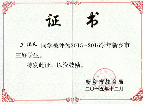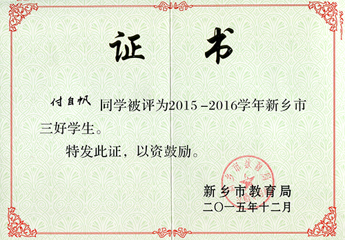 我校王佳庆、付自帆同学荣获新乡市级“三好学生”的光荣称号;高明恺、程煜娉、李楚琨、段然、王宇旸、马丁、任之初等7名同学荣获区级“三好学生”的光荣称号。