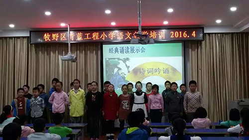 会议开始,先由四(1)班学生进行经典诵读展示,展示的篇目数量大,内容丰,形式多,是听课老师共同的感受。